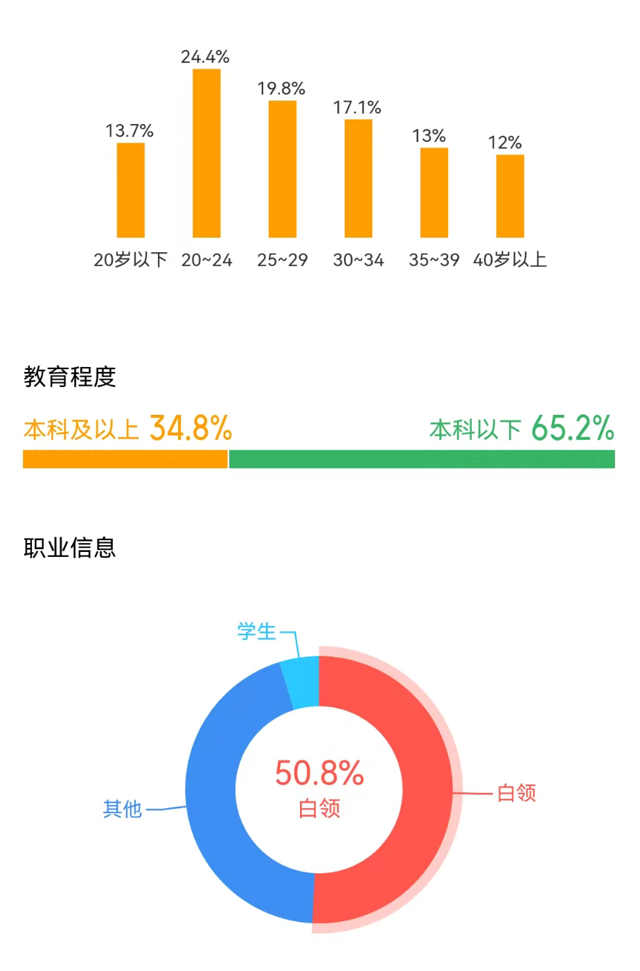 但用户画像说明问题。年龄占比这组数据,20岁以下(涵盖幼儿和学生)只占13.7%,成年人占比超过86%,其中比例最高的年龄段为20-24岁的年轻人,占比24.4%。