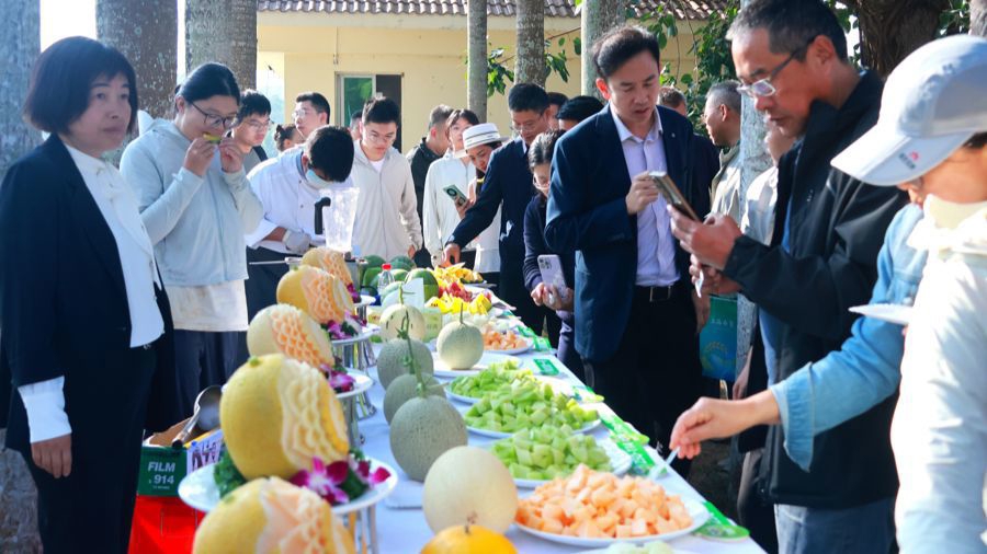 当天,在现场品鉴区,12个新优西甜瓜品种依次陈列,造型别致、色泽鲜亮,充分彰显品种特色,引得与会嘉宾、种植户代表纷纷驻足观赏、询问。一旁整齐摆放着切好的西甜瓜果肉,供大家随时品鉴。