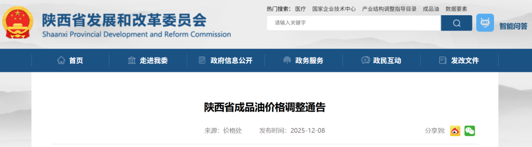 陕西省成品油价格调整通告